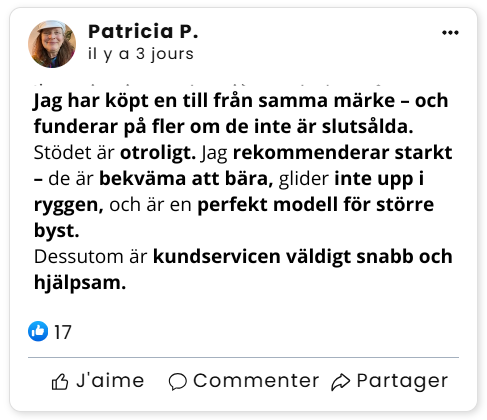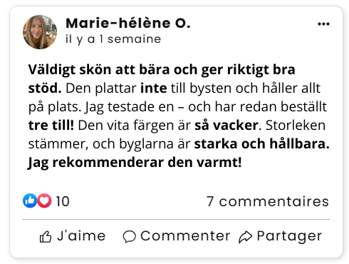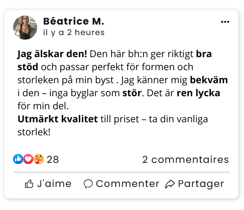 "Jag har aldrig lyckats hitta en bh som både lyfter, formar och ger stöd – förrän nu! Det är en helt ny upplevelse: jag känner äntligen stödet, och min siluett känns mycket mindre 'blockig' än tidigare!"