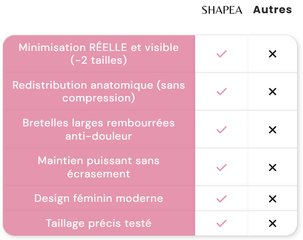 "Mina t-shirts hängde som gardiner över min byst. Shapea-bh:n gav mig tillbaka självförtroendet: den förminskar min byst, ger bekvämt stöd utan att någonsin sitta åt. Jag tog min vanliga storlek – perfekt."